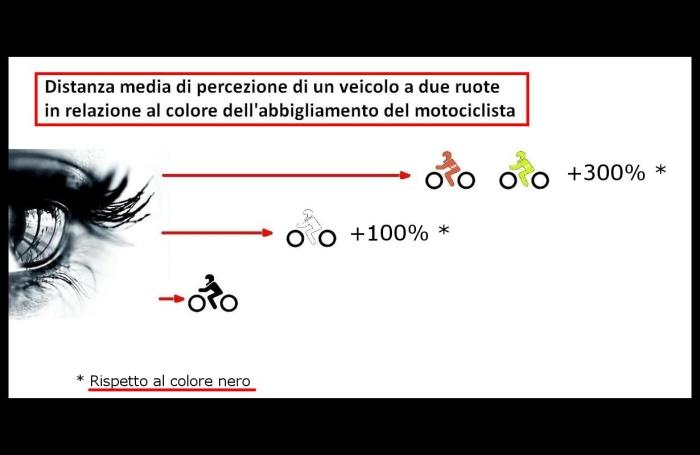 In condizioni di scarsa illuminazione un soggetto vestito in bianco ha la possibilità, in media, di essere visto da una distanza due volte superiore rispetto a quella di uno vestito in nero. Passando poi ai capi antipioggia ad alta visibilità, colorati in arancio, giallo o verde fluorescente e dotati di bande riflettenti, la distanza di visione rispetto al nero quadruplica.