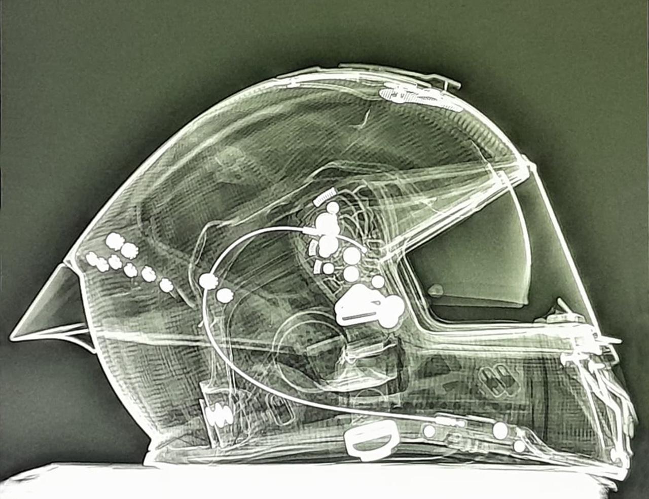 Le immagini ai Raggi X ci offrono lo spunto per farvi vedere la differenza tra la calotta in fibra e lo spoiler in policarbonato. La prima ha una trama tipo jeans, che è dovuta alla differenza tra le fibre ed il collante nel quale sono fuse. Il secondo invece è completamente “radiotrasparente”. Curioso, vero?