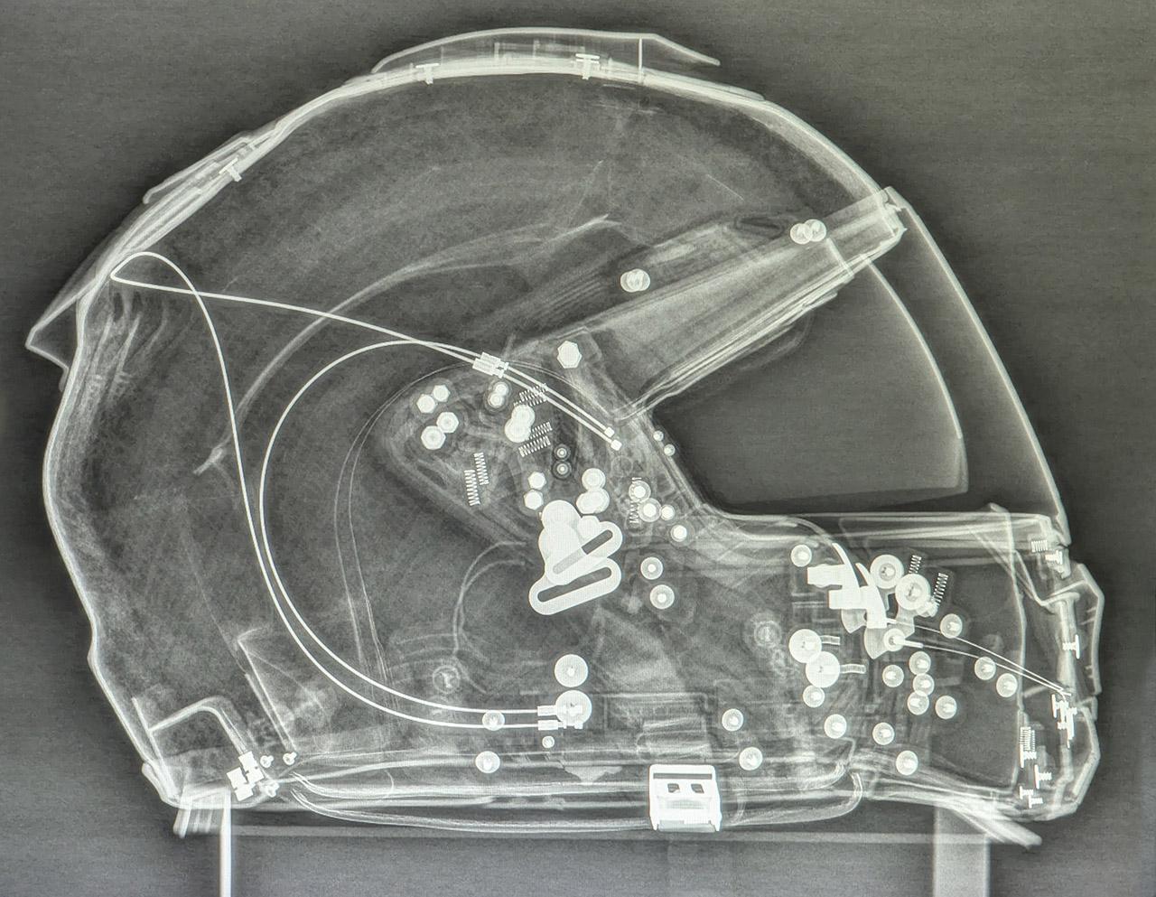 L’immagine ai Raggi X del nostro casco, ci mostra subito la trama del tessuto delle fibre, che compongono la scocca. Nascoste all’interno invece troviamo un’infinità di parti metalliche. Tantissimi bottoni di bloccaggio della fodera e innumerevoli vitine per fissare le prese d’aria.