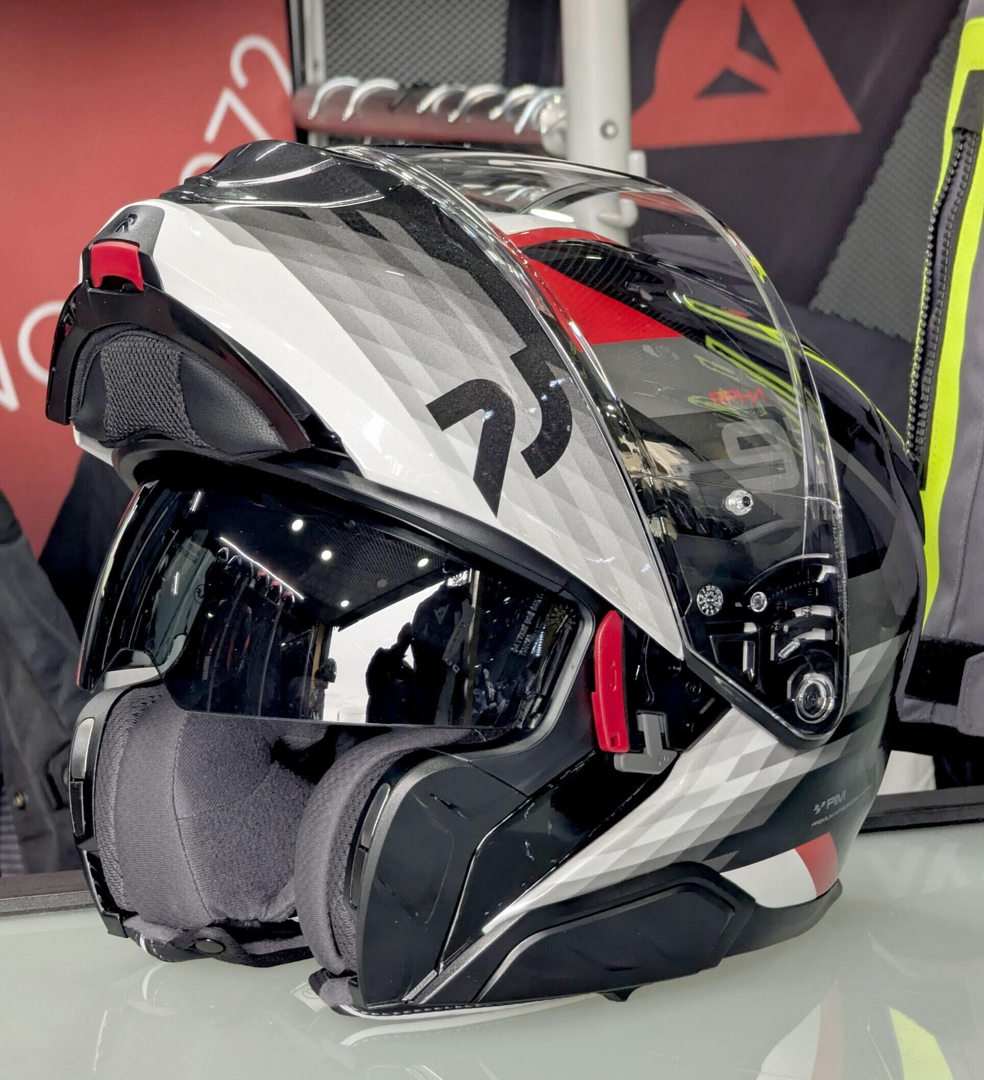 Molta più tecnologia, abbiamo trovato nella visiera parasole, che vanta un meccanismo a tre stadi, sia per regolare l’altezza del plexi, che la distanza dal viso. Una innovazione assoluta, molto figa ma dall’utilità relativa.