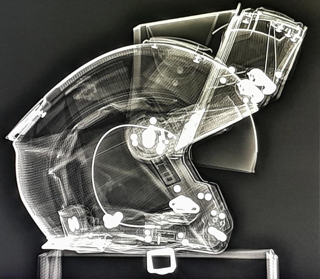 Detto questo, la radiografia ci mostra pochissimo metallo. Solo i ganci della mentoniera, le fibbiette del cinturino e qualche vitina di assemblaggio. La linea bianca al centro del casco, è il filo che comanda la visiera parasole ed i loghi NOS sono in plastica. Scelte dettate dall’esigenza di risparmiare peso, che su un modulare va tenuto d’occhio.