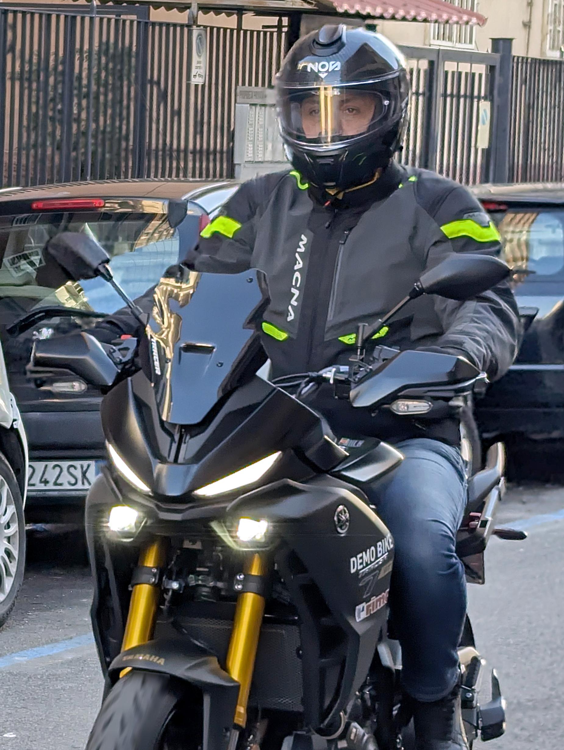 Saliamo in sella ed infiliamo il nostro NS-15C Carbon. Per farlo lo teniamo aperto e lo chiuderemo in marcia, ma il blocco mentoniera è piccolo e difficile da trovare, soprattutto con i guanti invernali. Pazienza. La prossima volta lo indosseremo con la mentoniera già sganciata.