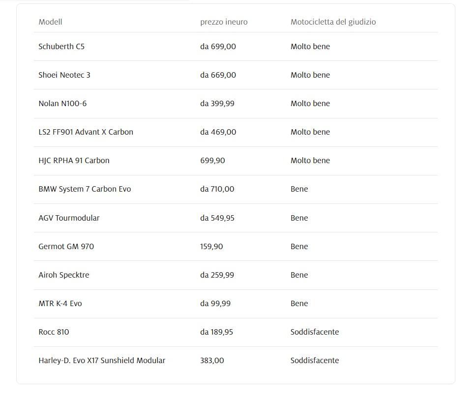 La rivista specializzata tedesca “Motorrad” ha recentemente pubblicato il risultato del suo ultimo test sui caschi per motociclisti. Questa volta, il focus è stato sui 12 modelli di caschi modulari, che prediligono la loro versatilità e la praticità. I risultati dei test condivisi anche dall’Automobile Club Tedesco (ADAC), dimostrano che se si sceglie una marca di caschi nota, non ci sono problemi di sicurezza, mentre ci si può trovare di fronte a un compromesso di comfort e rumore. Vediamo nel dettaglio a quali caschi bisogna fare più attenzione.