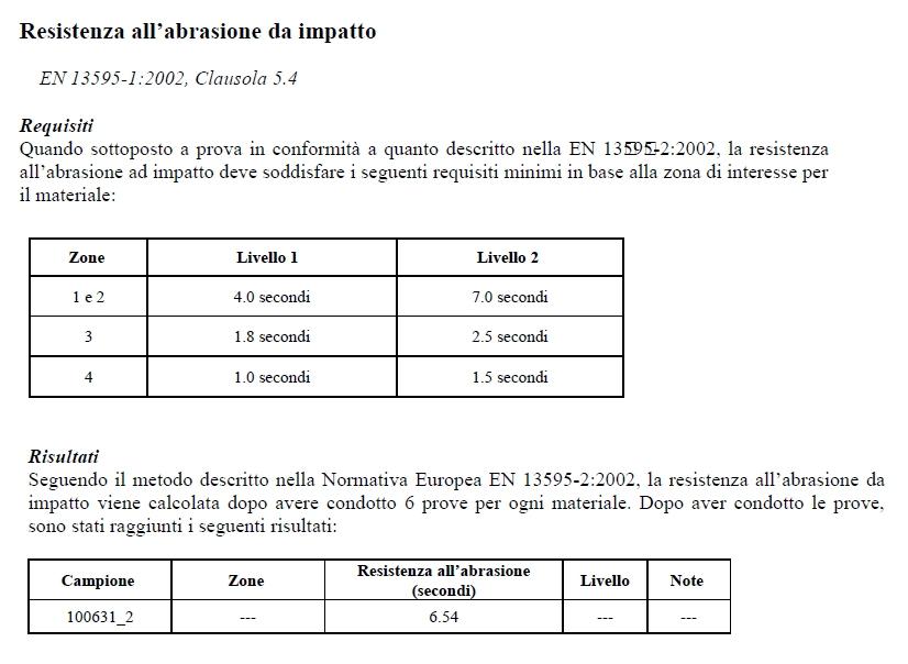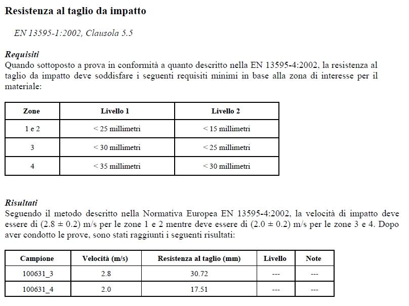 Ottimo, anche se perfettibile per le zone 1 è 2, è invece il test di resistenza al taglio da impatto, i cui risultati però diventano di più difficile interpretazione in merito all’utilizzo del doppio strato di pelle: