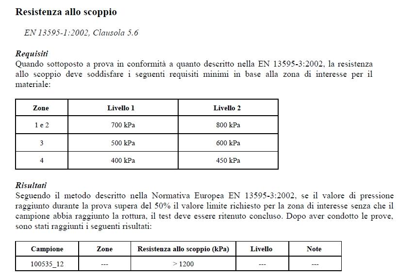 Ottimi sono anche i risultati emersi dai test di resistenza allo strappo ed allo scoppio, che superano con facilità i margini imposti dalle normative: