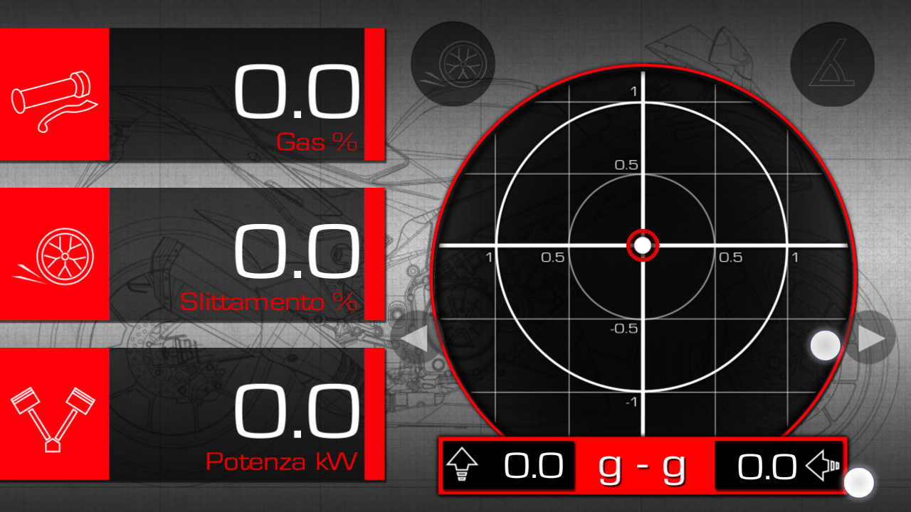 Gli strumenti visibili su questa schermata sono tre, uno circolare a lancetta e tre riquardi numerici. Scorrendo le due freccette ai lati, sul principale possiamo visualizzare: velocità, velocità media, rollio (angolo di piega), slittamento, forza G, contagiri, marcia (con indice di cambiata), apertura del gas, potenza istantanea, coppia, consumo istantaneo, consumo medio, batteria, temperatura. i riquadri laterali hanno le stesse funzioni nello stesso ordine. Ovviamente vengono saltate le funzioni già aperte da un’altra parte. Le grafiche sono azzeccate e divertenti, l’accoppiamento nero-grigio-rosso fluo, invece, non sarà il massimo dell’eleganza, ma è ben leggibile. In alto intravediamo le spie di allerta del controllo di trazione e dell’angolo di piega.