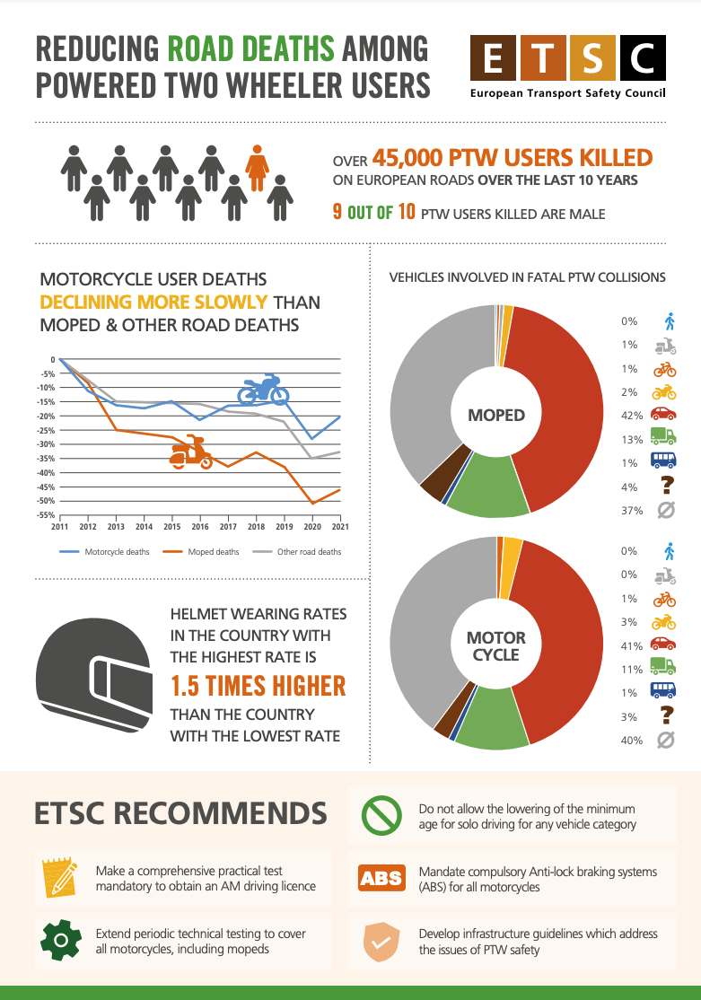 L’ETSC ritiene che la guida di un ciclomotore già a partire da 14 anni, come avviene in Italia ottenendo la patente AM, sia rischiosa. “L’età minima consigliata per guidare un motorino nell’UE è ora di 16 anni ma, in diversi paesi, è ancora possibile guidare all’età di 14 anni, senza superare una prova pratica”. L’ETSC chiede quindi a tutti i Paesi membri dell’UE di rendere obbligatorio un test pratico e normare l’età minima raccomandata di 16 anni o superiore.