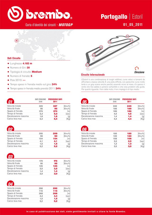 “Il tracciato di Estoril è uno dei più impegnativi di tutto il calendario ed è caratterizzato da una varietà di curve lente a sinistra, curve veloci a destra e rettilinei impegnativi che mettono a dura prova il pacchetto moto, pilota e pneumatici. La configurazione della pista e il manto stradale variano da una curva all’altra e i pneumatici sono particolarmente sollecitati nel giro singolo dopo il parziale rifacimento dell’asfalto avvenuto nel 2006. La combinazione di curve lente e veloci, compresa l’ultima curva finale lunga e veloce e la chicane molto lenta, richiede l’utilizzo dello pneumatico posteriore asimmetrico per bilanciare la temperatura dei pneumatici in entrambe le spalle e per garantire un grip consistente in ogni giro. Per l’asfalto scivoloso è necessario utilizzare le mescole più morbide per generare grip e un buon riscaldamento del lato sinistro del pneumatico, mentre le veloci e lunghe curve a destra comportano l’utilizzo di una mescola più dura nella spalla destra del pneumatico posteriore per affrontare una temperatura più elevata. Le pesanti frenate, specialmente nella prima curva, richiedono un solido pneumatico anteriore. Per questo motivo abbiamo cercato di raggiungere un buon equilibrio nella selezione dei pneumatici da utilizzare”.