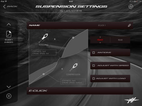 Aprendolo ci troviamo di fronte all’elenco dei nostri setup, selezioniamo quello che vogliamo modificare o creiamone uno nuovo e scegliamo se lavorare prima su Front o Rear. Ci apparirà un grafico diviso in due: la parte superiore è la regolazione dell’idraulica in estensione, la parte inferiore la regolazione in compressione. Ora seguiteci attentamente: il grafico ha un’area grigia ed una linea. La linea rappresenta la nostra regolazione in corso, l’area grigia(lo vedete nella foto) è lo spazio entro il quale muoverla. Se cambieremo impostazione da soft a medium ad hard troveremo aree di lavoro grigie diverse, più o meno estreme. Disegnato l’algoritmo di funzionamento possiamo abilitare le funzioni di antiaffondamento ed adattamento a velocità e al carico. Ovviamente, ma è un peccato, il settaggio manuale spegne il programma Skyhook, un software dedicato al comfort comune a quasi tutte le sospensioni di questo tipo, che lavora in modo da contrastare i saliscendi del corpo moto, come se invece di essere poggiata a terra, la moto fosse agganciata al cielo (Skyhook, appunto).