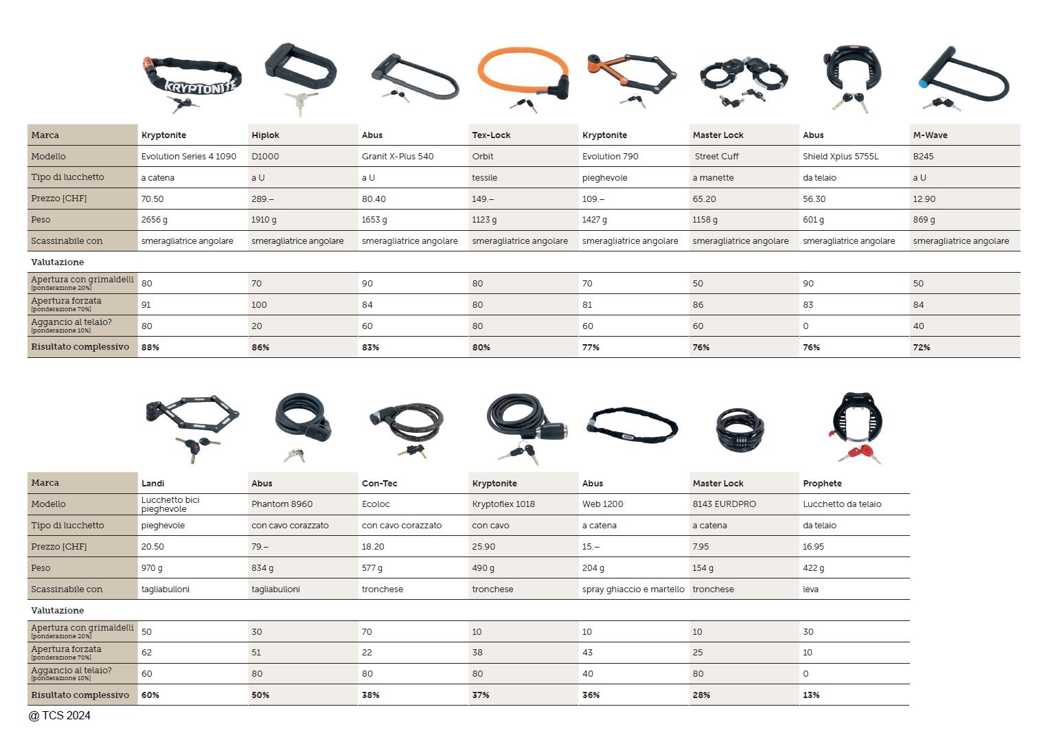 Clicca l’immagine qui sotto per vedere i risultati in dettaglio dei lucchetti per bici testati dal TCS.