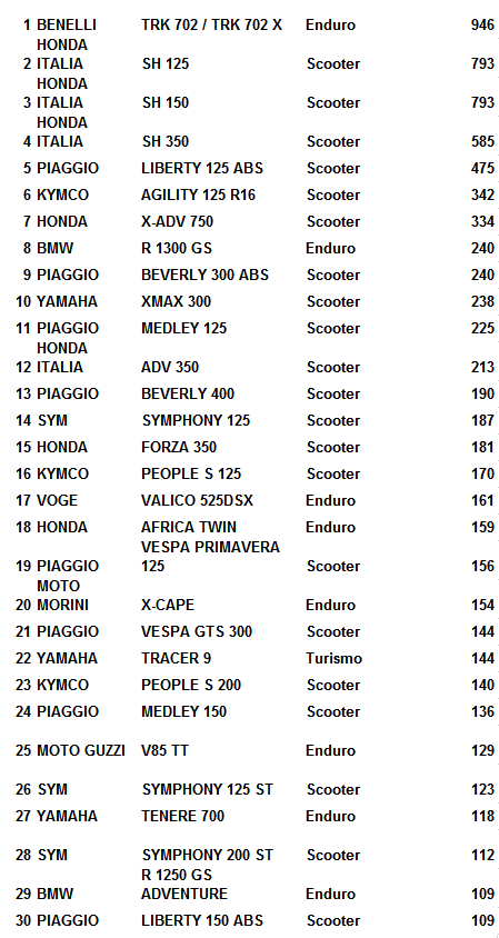 TOP 30 MOTO E SCOOTER PIU’ VENDUTI A NOVEMBRE