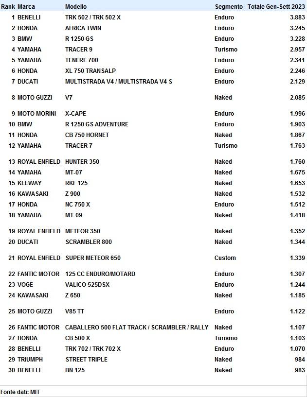 Gli scooter continuano a essere i protagonisti del mercato italiano, con 14.230 veicoli immatricolati nel mese, registrando una crescita del +26,01%. Le moto non sono da meno, evidenziando un incremento del +19,56% rispetto allo stesso periodo dello scorso anno, e totalizzando 11.208 unità vendute. Nonostante questo positivo trend generale, i ciclomotori sembrano attraversare un periodo difficile, con una diminuzione del -5,72% e 1.649 unità vendute in settembre. Ecco di seguito la Top 30 delle moto più vendute, clicca sull’immagine per vederla a tutta larghezza.