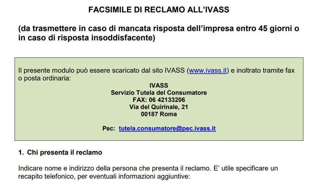 Per presentare un reclamo all’IVASS bisogna servirsi di un modulo ad hoc (scarica qui) da compilare in ogni sua parte, descrivendo con dovizia di particolari il comportamento della compagnia assicurativa che si ritiene irregolare o scorretto. Si possono aggiungere in allegato altri documenti che possano aiutare a valutare la condotta o il servizio oggetto di lamentela, compreso il reclamo già inviato alla compagnia e l’eventuale risposta. Non è necessario invece inviare certificati e cartelle mediche, foto e documenti di riconoscimento. L’intera documentazione può essere inoltrata: